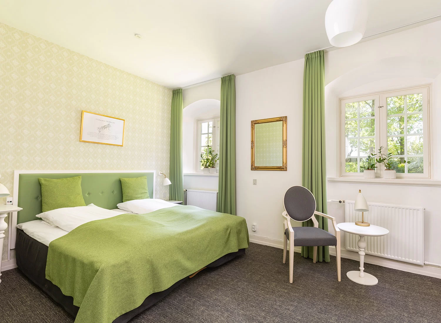 Størstedelen af værelserne fremstår i slotsstil, mens de resterende værelser i staldene er renoverede i moderne og enkel stil. Uanset hvilket værelse du vælger, vil du opleve, hvordan historien spiller en stor rolle i indretningen. Her i Middelfart forenes charme, komfort og atmosfære i enestående omgivelser.