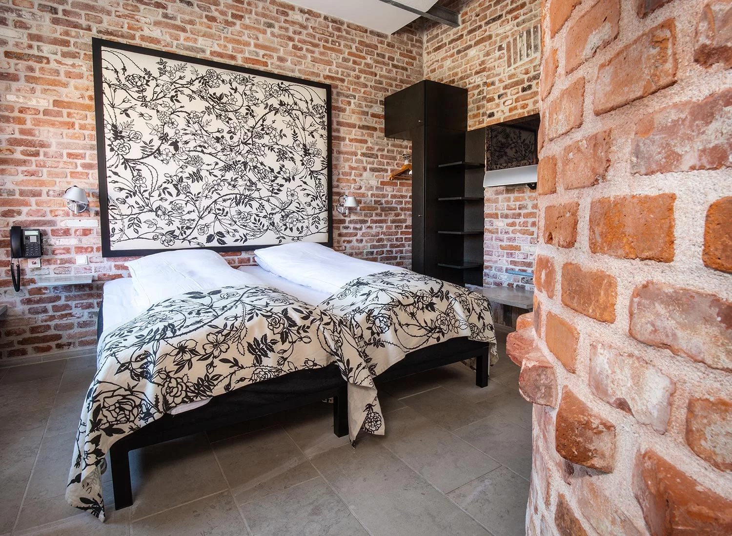 Værelserne i de tidligere ko- og svinestalde er moderne i deres udtryk. Her kombineres elementer fra den oprindelige staldbygning med moderne hotelløsninger. De rå vægge i genbrugsmursten står i kontrast til det hvide loft og de smukke stofbeklædte sengegavle. De fritstående, runde brusenicher giver et skulpturelt præg til rummet.